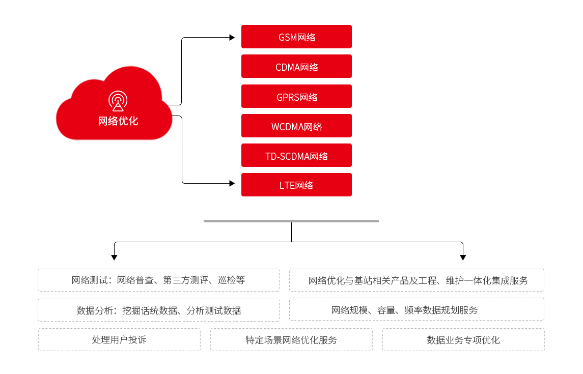 公司具有專業(yè)的網(wǎng)絡優(yōu)化分析團隊,具備多廠家、多運營商的綜合性網(wǎng)絡優(yōu)化能力,針對GSM、CDMA、TD-SCOMA、WCDMA、LTE等多種制式的無線網(wǎng)絡,提供整體的優(yōu)化解決方案,包括建網(wǎng)初期相后期擴容工程的工程網(wǎng)絡優(yōu)化服務、運維期間的日常網(wǎng)絡優(yōu)化服務、階段性分析解決網(wǎng)絡瓶頸的專項網(wǎng)絡優(yōu)化服務,通過測試數(shù)據(jù)分析、話統(tǒng)數(shù)據(jù)分析,結合天饋線系統(tǒng)優(yōu)化、無線參數(shù)優(yōu)化話務均衡等方式,對網(wǎng)絡性能指標進行優(yōu)化提升,最終達到提高網(wǎng)絡質(zhì)量以滿足終端用戶需求及提升網(wǎng)絡設備利用率的效果。